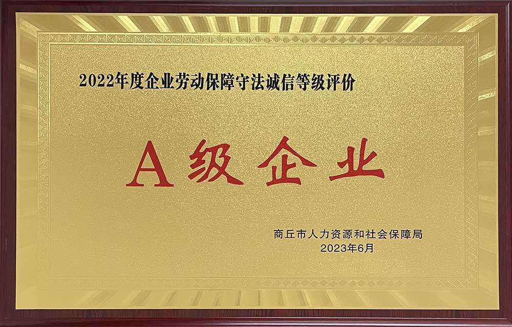 我公司近日獲得商丘市人力資源和社會保障局頒發的勞動保障守法誠信A級企業榮譽證書,這是對公司長期以來遵守勞動法律法規、維護勞動者權益、規范市場行為及保持良好社會形象等方面給予的充分肯定。
